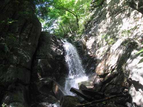 小滝連瀑の最初の滝は3mほどである。釜の中に入り、右側から登る。少し滑っぽいが特に難しいところはない。二段目は流水を横断して流水の左側から登り、落ち口で流水中に一歩足を置いて右に移動する。