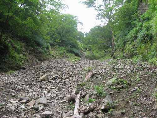 ガレ場状の所々に小さなナメや小滝が幾つかあった。水が涸れて、これで沢は終わりかな、と思っていると再び水流が見えてきて、それが前に増していっそうの量で流れたりして、………。