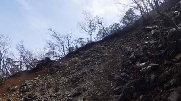 石碑らしいものはないか周囲に目をこらしつつ崩落帯中を登った
