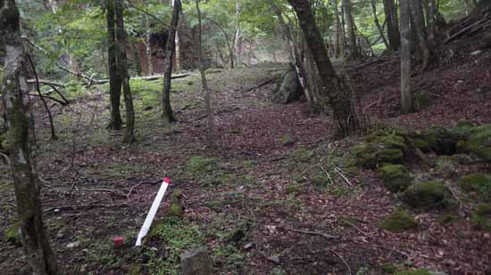 そこは人為的な平坦さが感じられて、札掛の木が健在だった昔に山回り役人が巡回するための三角掛けの宿泊小屋か、あるいは造林小屋とかがあったんだろうと想像するが、