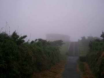 を読み、直進するとロープウェイ駅が霧の中に浮かぶ。