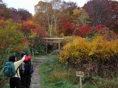 振り向けば湿原の草紅葉の向こうに登ってきた山々が緑に映え