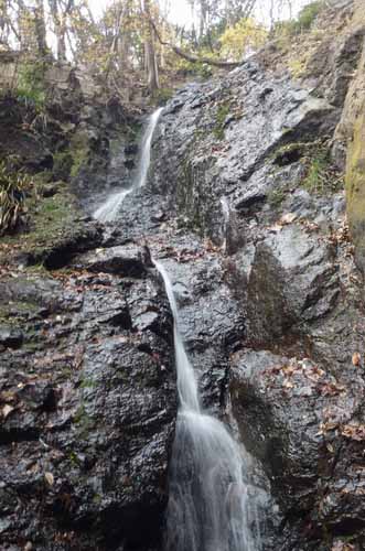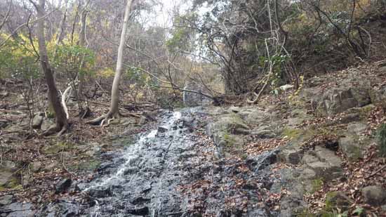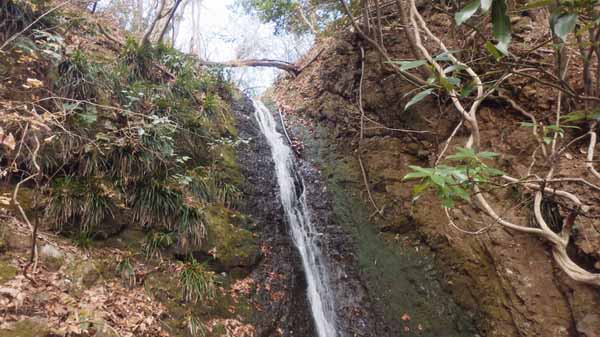 おそるおそると橋から入って下り気味に奥に20m進むと最下段の滝(8mほどで傾斜は緩い)のすぐ近くで沢床につく。