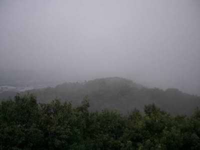 目を上げれば煙にかすむ鳶尾山に八官の山々。