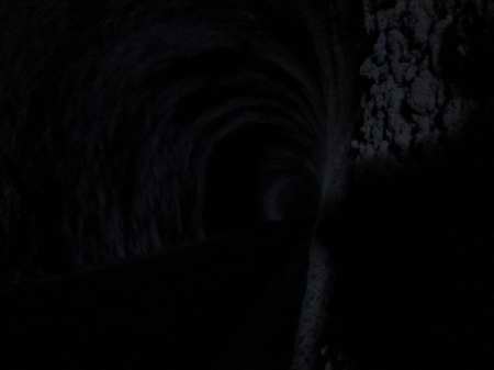 いやいや、火が消えて少しの合間に少しだけ目が闇に慣れ、光の対する感度が上がって歩いてきた入り口方向にだけ僅かな光が感じられる。入り口から入って直進してきたつもりだが、川に沿う形で緩くカーブしているトンネルは入り口から50m程で光がほとんどなくなるが、それでも壁で反射したごく少ない光がモヤ〜と闇夜に慣れると見えるのだ。まずはいったん撤退しよう。