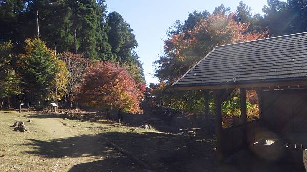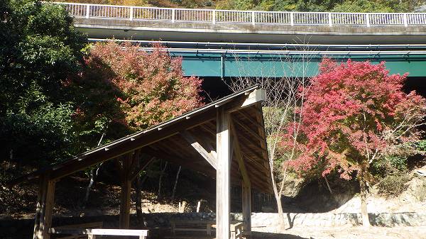 それを渡り終えたガードレールの脇から湖側に入って道路続きをちょびっと歩くとカエデ樹の紅葉鮮やかな東屋も立つ小さな広場になっていて、そこから見上げる青山トンネル続きの道路は青山橋となっている。