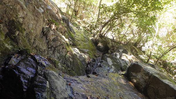 急では無いが、ツルツルスラブなので上から岩場に垂れている虎ロープも使って左側から回り込んで三段目の基部に立つ。
