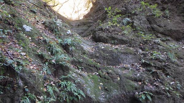 落口直下がスラブ状に急であり、岩質も脆そうであり、確保無しでは登れない。