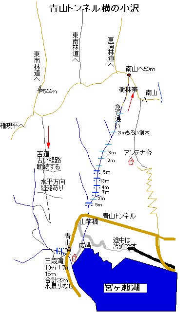 青山トンネル反対側から南山に登る小沢に何かありそうな気はしたが、歩いた結果は出会いの棚の外に滝が無かったので、こちらでも多くを期待するのは止めておこう。