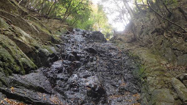 すぐにゆるい4m程の滝がある。岩が濡れているので岩のつぶつぶにソールの目を食い込ませて滑らないようにして登る。