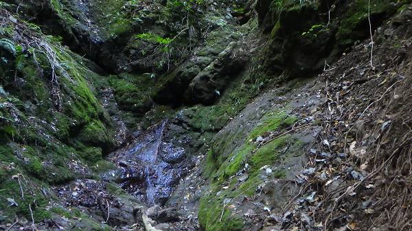 岩床はしばらく続き、岩の中程から清水が吹き出す5mほどの滝まで続く。