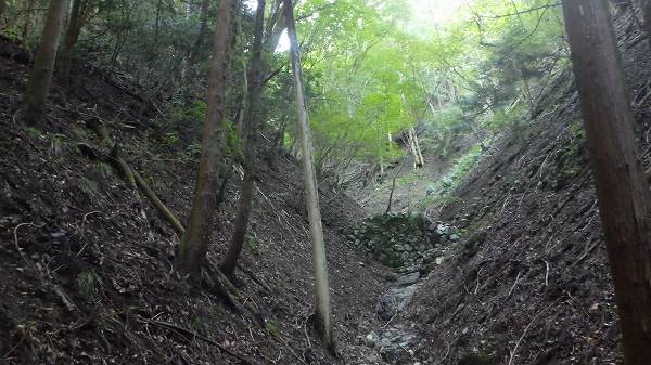 乾いた3mほどの小滝を過ぎると左岸すぐ近くに尾根があり、おそらくそこに抜ければ遊歩道に出るのであろう。