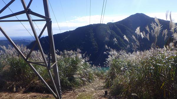風にススキがそよぐ、権現平まで行って戻り、鳥屋集落への遊歩道を下る。