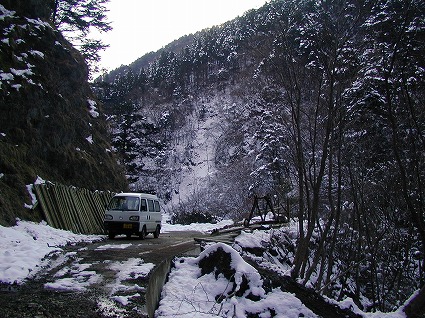 そんな想いが通じたのか、幸いにも日のあたる場所に一台だけ対向車があったが、それ以外には追い越していく車は無く、完全凍結の「桶小屋橋」もそろりそろり無事に通過して「塩水橋」に着く。