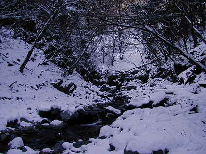 流れの際の石は薄氷がバッチシ貼り付き、濡れるのがイヤだからと歩くのは雪の乗かった飛び石の頂角点、もしくは水から大きく離れた場所になるから、歩けるところはごく限られてしまう。