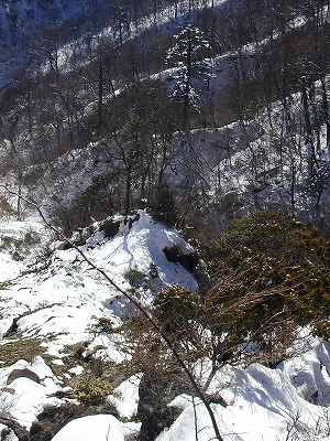 ナメでは薄氷の着いたところを避けて何とか登り切る。