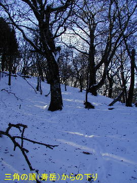 数台の車で固められた路面は、日陰では踏み固められていない部分で10cm以上、白い圧雪が5cm以上、日当たりでは3cm厚に固く凍結していて、こんな寒い日にはズボンのポッケに両手を突っ込んでズボラ歩きでいたかったのに、ツルッツルッ滑って不安定で、両手を広げてバランスを取りながらも何時転ぶかと危なくってしょうもない。札掛→長尾尾根の吊り橋を渡った二人の靴跡を過ぎると、歩行者の跡はない。