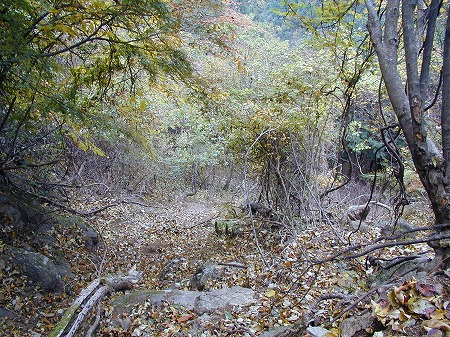 唐沢林道からは辺りの紅葉を眺めながら、この林道を歩くのも良いだろうが、今回は、林道に出たところから、その林道を突っ切って更に辺室沢に向かって下降する。