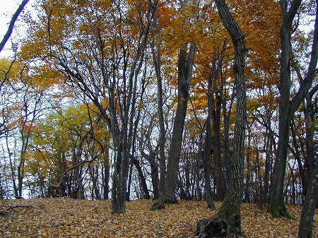 所々に道のような痕跡もあるが、歩くところを気にする必要もなく、辺りの木々の色合いと空を見上げて歩く。