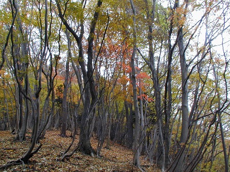 広い尾根はゆったりと左曲がりに下っており、山頂の檜林を抜けると今は紅葉の真っ最中である。