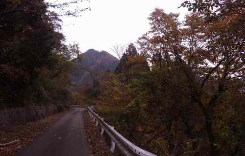 下っていく林道の中央上に三角形の華厳山が紅葉に彩られているのが見える。