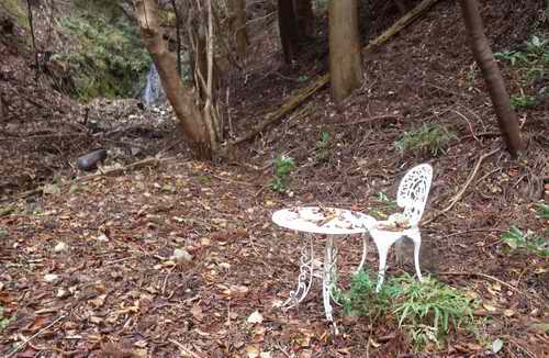 椅子はその滝を見るための方向に向けられているが、椅子に座ってまでじっくり眺めるような滝ではなく、椅子の向きがそうだったのはたまたまだろう。