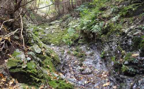 そして幅広いが、そんなに高くない岩の中から汗を掻くように染み出すような感じに湿っている障壁の中の6mほどの滝に行き当たる。