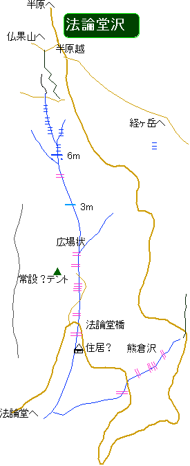坂尻から半原越への道があり、そこに流れる川は民家のあるところでは法論堂川というらしいが、リッチランドから幾分か乗越側に寄って川が林道を横切り、そこに架かる橋が法論堂沢橋ということになっているから、そこから奥が法論堂沢に換わると言うことになるとおもう。