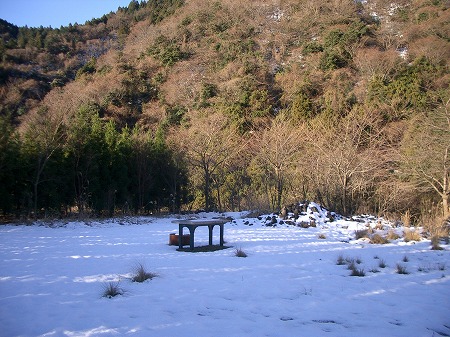 そこで、もう一度見直すと、林に入ってすぐの所に杉の木に隠されて少しだけ見つけづらかったが尾根に向かう急なブル道があった。それを100mも登ると、大回りをしてくるトラック道と再び合わさり、折り返しの広場まで進んで車道は終わっていた。 その広場は休憩場用として石作りの立派なテーブルが一脚設けられているが、上には一昨々日の雪がこびりついているだけであり、ここしばらくは誰も使っていない。
