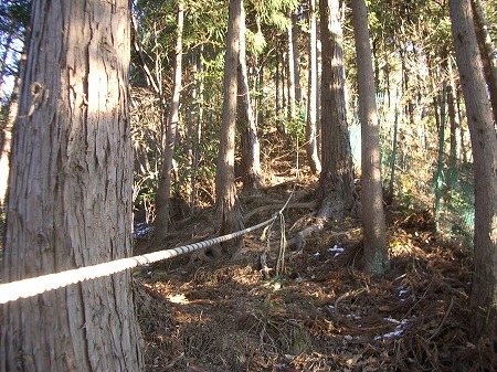 しかし、長い間、だれも使っていないのか、ロープはおおよそ半分が土の中に埋もれ、強く引っ張っても表に出てこない箇所も多い。そして、途中、全く息も付く場所もなくトラロープを握ったままで山頂から華厳山方向に200m程寄った場所で尾根に飛び出した。