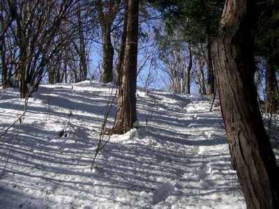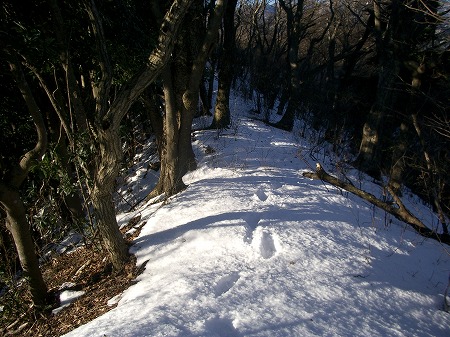尾根にはこの前に降った雪が深いところで20cm程だ。大した雪量ではないが、久しぶりに雪の中を安物の運動靴で歩く感触はとても良い。