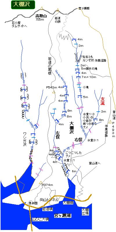 大棚広場から、これまた歩跡の残る仕事道を踏んでP493mへの作業径路に入り、急登を過ぎたら左の鹿柵入り口に入って棚沢橋の最奥部にある滝上に降る。