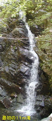 続くのは、下の7m程の大岩を含めると25mにはなろうかという、この沢唯一の大滝だ。