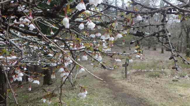 導かれるように東海自然歩道に出て、そこからは歩道を行く。すぐに原小屋跡。流れる霧が上方に舞い上がって消え、霧の間から日が差す。1400m付近では豆サクラは今が盛りと咲く。姫次