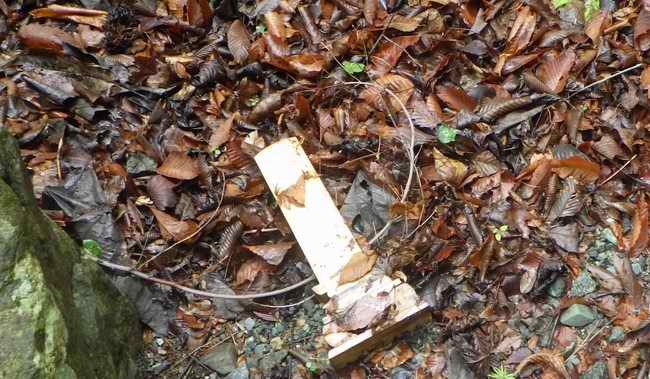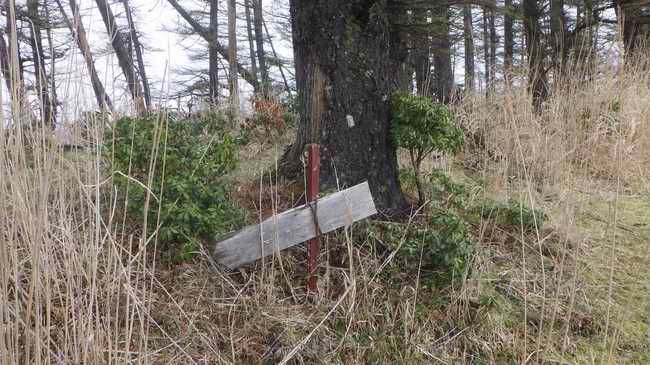 手作りした一連の登山標識の一個(板を止める捨縄は私、結わえ直したのはs-okさんだ)
