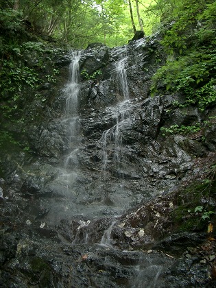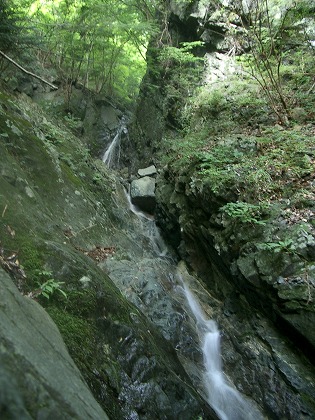 ここも出合では流れが伏流になっていて、入り口の灌木をくぐって中に入ることで、沢になっていることが分かる。狭く暗いナメ状の上に6mほどのナメ滝が見え、沢は右曲して続く。