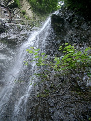 上に続く急傾斜なルンゼ、中域下の大滝から飛び散る飛沫から