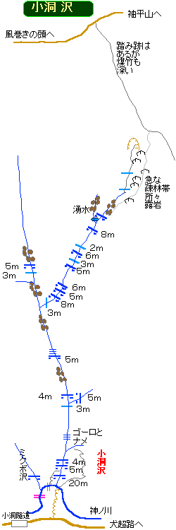 自宅4:45〜宮が瀬湖5:40〜エビら沢6:50〜神ノ川ヒュッテ7:10〜小洞沢出会い〜ミクボ沢見学7:40〜小洞沢F1(大滝)8:00〜左岸を巻く〜F3上9:00〜F1落ち口9:05〜二股9:40〜本流見学ナメ滝上9:50〜二股9:55〜湧き水10:40〜支尾根〜歩道11:25〜風巻の頭11:40〜神ノ川12:00〜矢駄沢(汚れ物洗濯)12:00〜神ノ川ヒュッテ12:25〜青根諏訪神社700年の大杉を見る12:55〜宮が瀬湖〜自宅14:30 2003/08/02 曇ったり晴れたり、時にはぽつんぽつんと雨粒が落ちてきたりと忙しくも自転車をこぐのがとっても暑かった日だった。