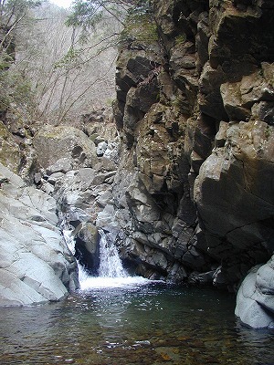 その水は左右に高い岩が聳える狭いゴルジュの中から流れ出る。