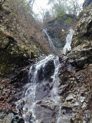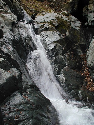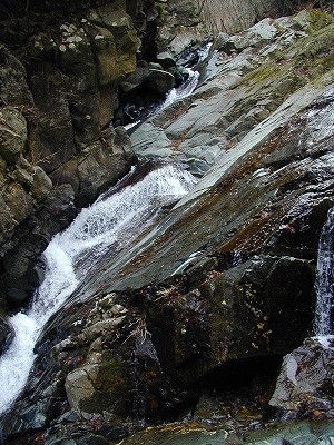 正面に5〜7m程の平板な岩の上を幾筋かの水が流れる滝となる。