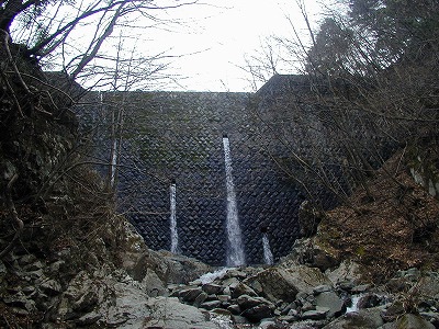 せまい場所とはいえ、40m幅ある沢の中に30m近くの高さを持ち、放水口が中段下部に5〜6個もあり、それぞれの口から勢いよく水が噴き出す。