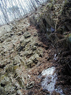 岩稜が行く手を遮り、雪が無くなったばかりの踏み跡の下は、でもまだ氷が潜んでいて、