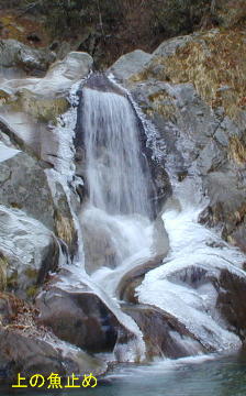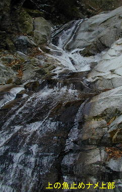 沢に入って最初の「魚止めの滝」は流れの左のカンテ状を上がる。