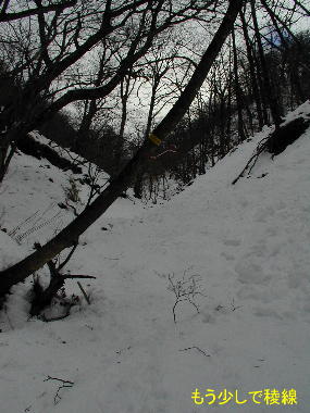 徐々に増してきた積雪は場所によっては膝上までの深さになり、斜面の雪を分けるのが 「メンドウだな」 と思う頃に、見上げると階段歩廊が見え、そこからは一登りで登山道である。