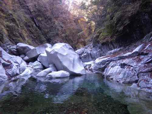 大きな石の向こう側が降りれられなくては戻って前進方向を河原の右側から左ヘと、どこかには必ず簡単に進んで行けるところがあって、大きな岩がモミュメントのように立っているところまで行けばザンザ洞が左手から小滝で降りてくる。