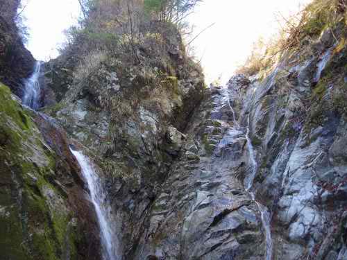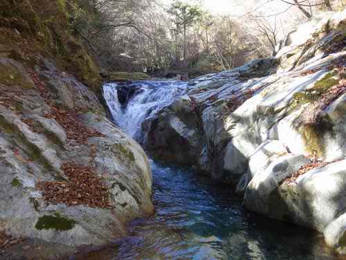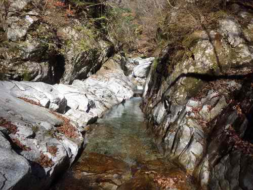 濡れずに行くなら右岸の一カ所がちょっと難しくなるが、先ほどの動作で今日は無理と諦めて水流中を奥に入り、そこから左側の岩を簡単に登る。大きく足を上げる度に腰が突っ張る感じがして、チクッとどうも思わしくない。ひどくならなければいいのだが、筋肉のこわばりが本物の傷みに転じることだってある。