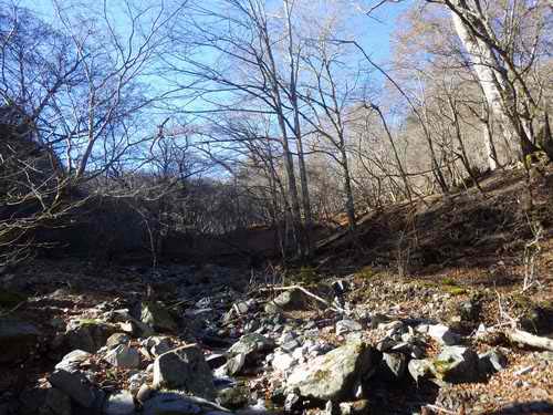 少し行くと金山谷の頭に入っていく小沢があり、その次が乗越沢、以前には登山標識、ケルン、ちょっと前までは立ち木テープのマークもたくさんあったはずだが、標識類を見つけられなくなった。