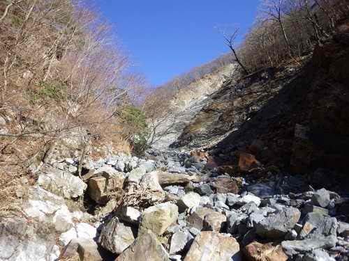 経角沢の終わりと同じように、こちらも入り口は土と砂の緩い斜面で歩きやすいが、直ぐに砂に石の混じった固い河原状に代わり、それもつかの間、右手前に崩落帯が見える頃になると岩床の上に何重にも砕けた石が積み上がっている一面がらがらの石河原となる。