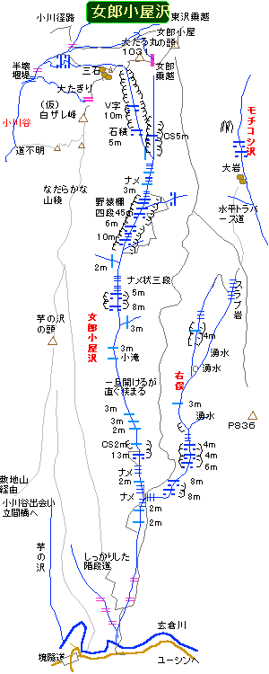 自宅4:55〜本厚木5:18〜新松田5:55富士急バス〜玄倉6:40〜女郎小屋沢出会い7:35〜最初の二俣8:05〜右股10m滝〜本流13m滝8:20〜野猿棚手前10m滝9:15〜10m棚を巻いて野猿棚を巻き終わる10:45 1時間25分も巻きにかかったことになる〜奥の二俣10:55〜左乗越上11:20〜小川谷F12上堰堤付近に下降11:45〜小川谷径路〜県民の森12:25_12:35この辺りは今大正杉の切り出しに忙しく、春先からずっと奥までの車輌進入はたった400m程の距離だが制限されている。〜玄倉13:15_13:26富士急バス〜谷峨13:55JR〜新松田14:11〜本厚木〜自宅15:00頃 2003/06/07朝方は晴だが、徐々に薄雲が拡がる