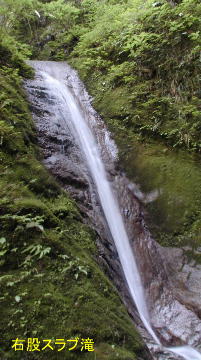 左に小滝の小沢を分け、狭い沢は一段と狭まって10mのスラブ滝。